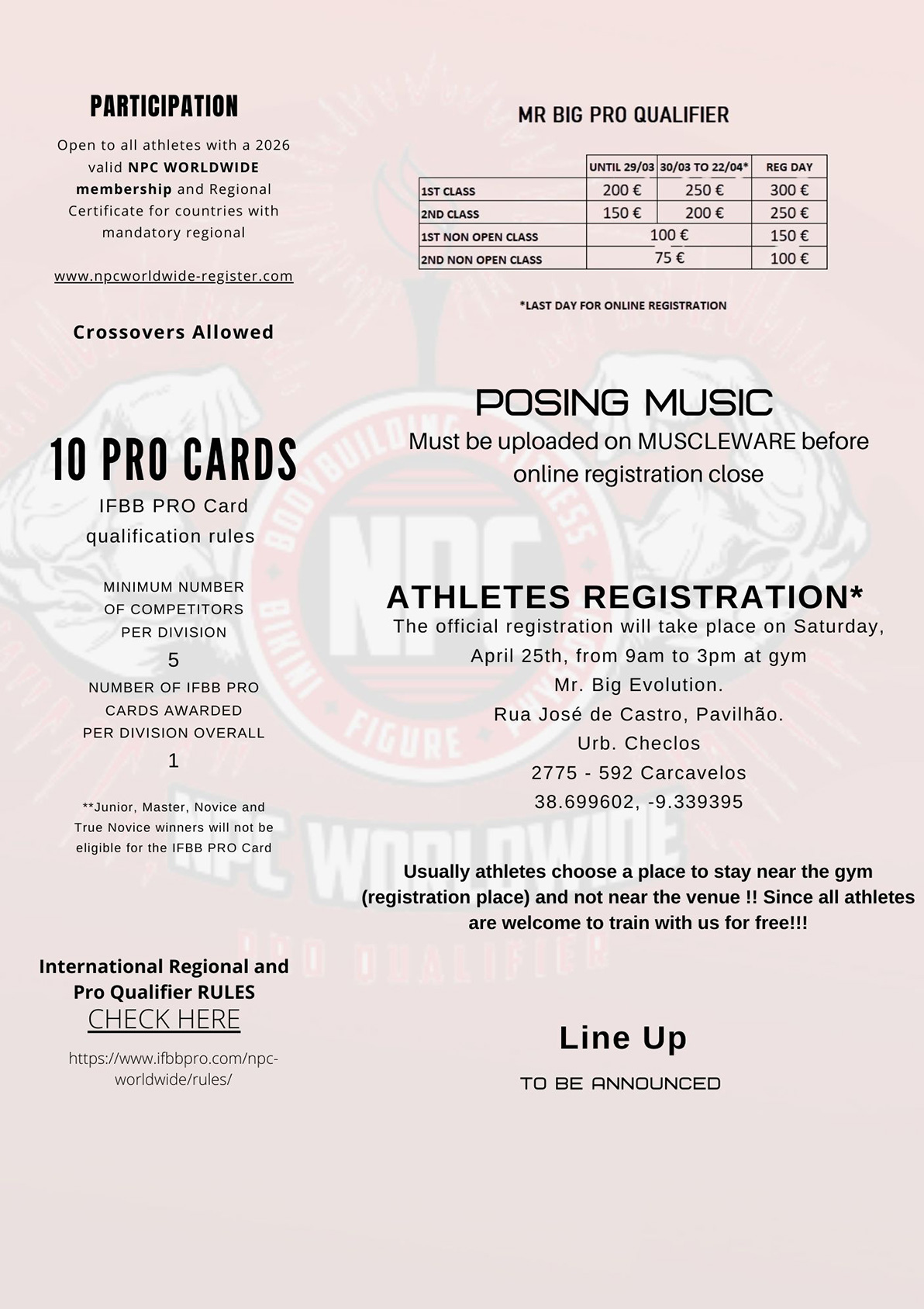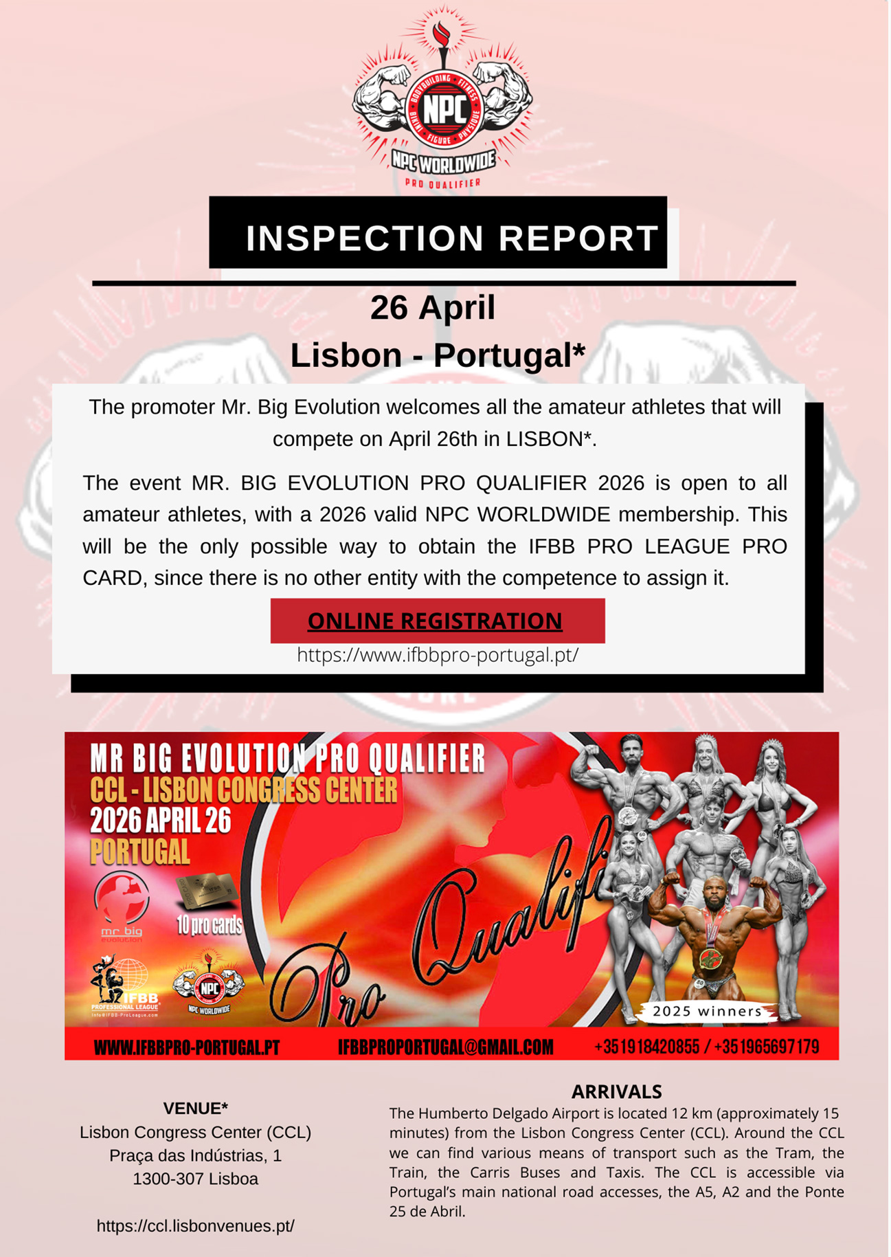 ONLINE REGISTRATION Tickets to see the show INFORMATION SERVICES TANNING/BACKSTAGE/FOTOGRAFIAS INVITATION LETTER INSPECTION REPORT NPC WORLDWIDE MEMBERSHIP INTERNATIONAL REGIONAL AND PRO QUALIFIER RULES