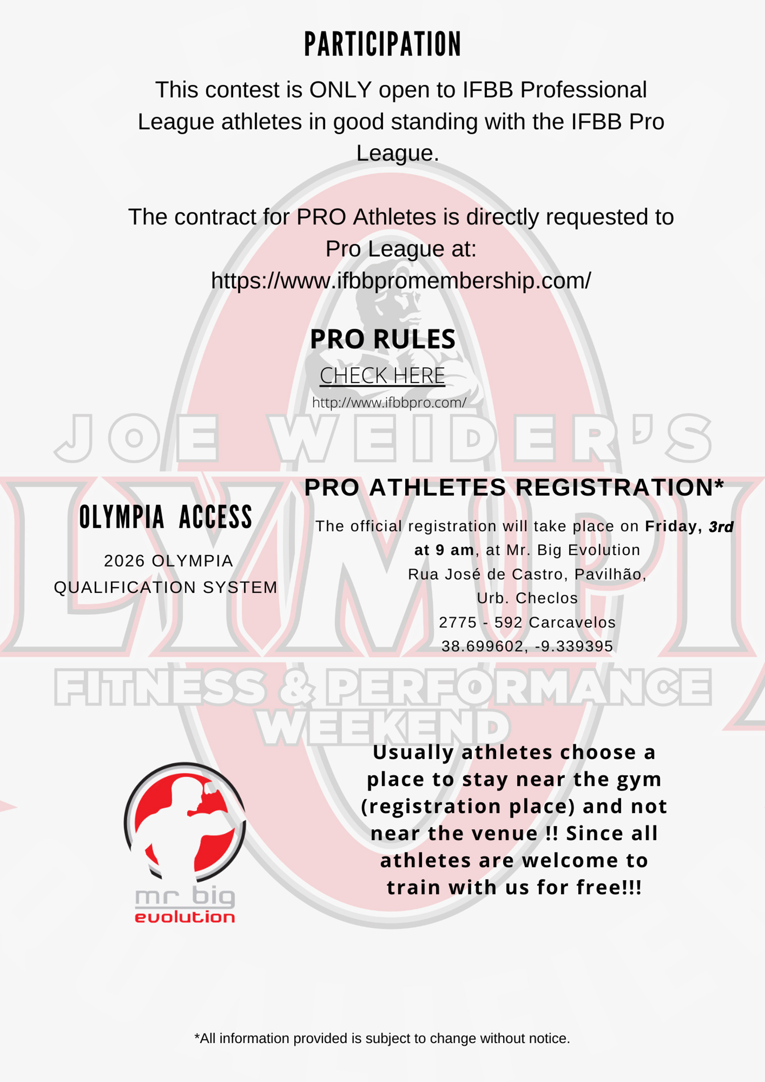 For your MR BIG EVOLUTION PRO contract : IFBB PRO MEMBERSHIP SERVICES TANNING/BACKSTAGE/FOTOGRAFIAS INVITATION LETTER INSPECTION REPORT